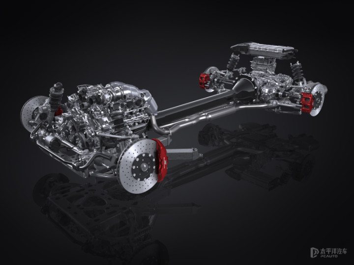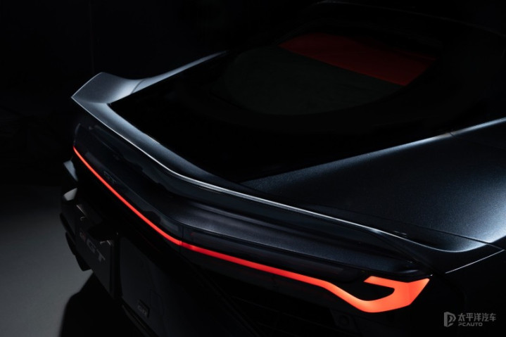 车尾造型夸张,后置四出排气抢眼,贯穿式尾灯两侧采用勺状设计,视觉上拓宽车身。尾灯周围黑色装饰实则气流出口,用于混动系统、变速箱及刹车散热的气流由此排出。